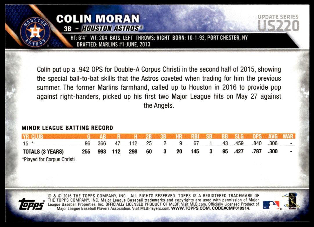 This BaseballΒ card, from 2016 is part of the Topps UpdateΒ card set. Colin Moran is featured and has a card number of US220.