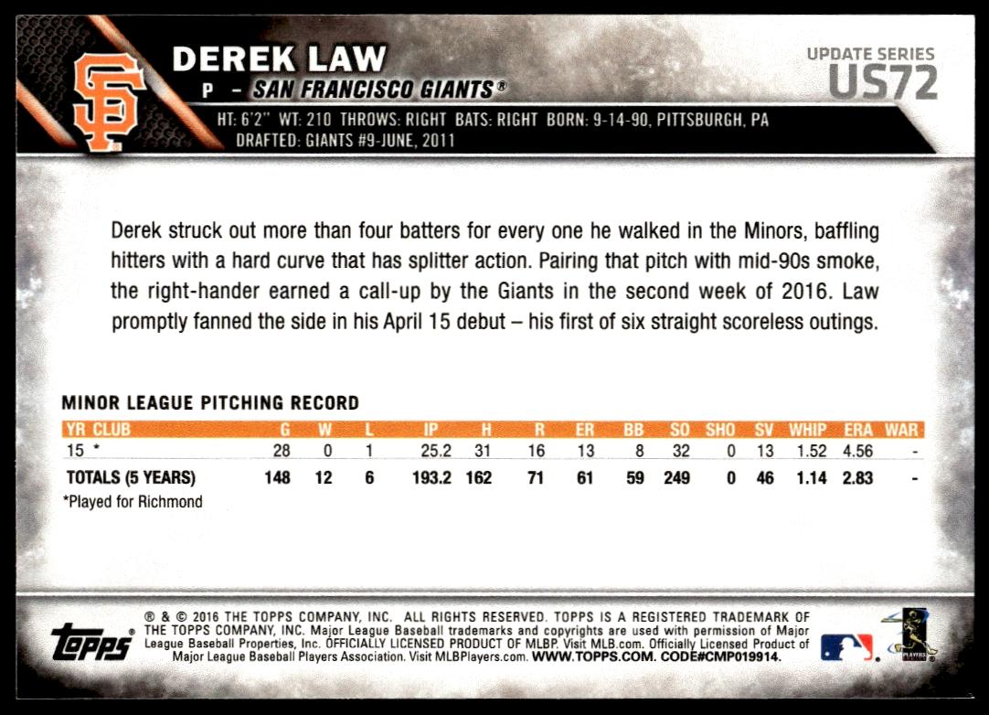 This Baseball card, from 2016 is part of the Topps Update card set. Derek Law is featured and has a card number of US72.