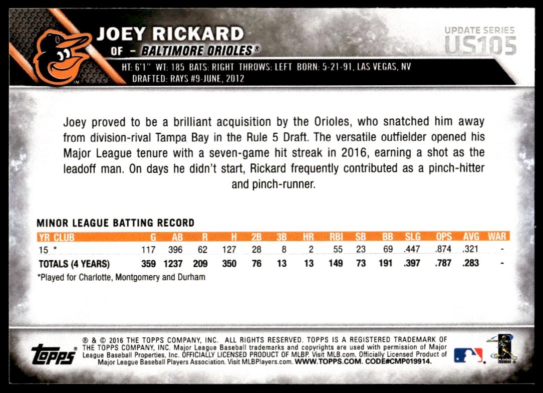 This BaseballΒ card, from 2016 is part of the Topps UpdateΒ card set. Joey Rickard is featured and has a card number of US105.