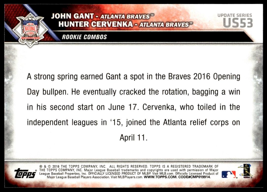 This Baseball card, from 2016 is part of the Topps Update card set. John Gant / Hunter Cervenka is featured and has a card number of US53.