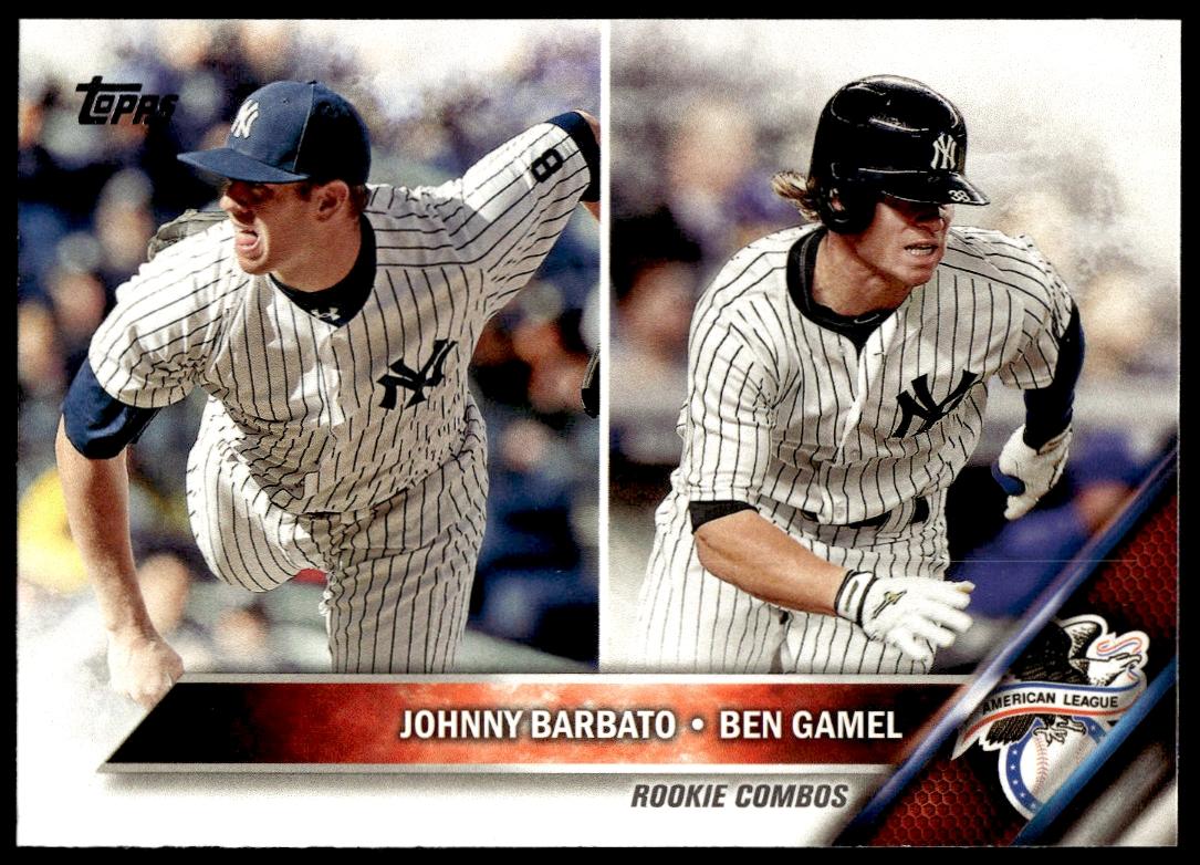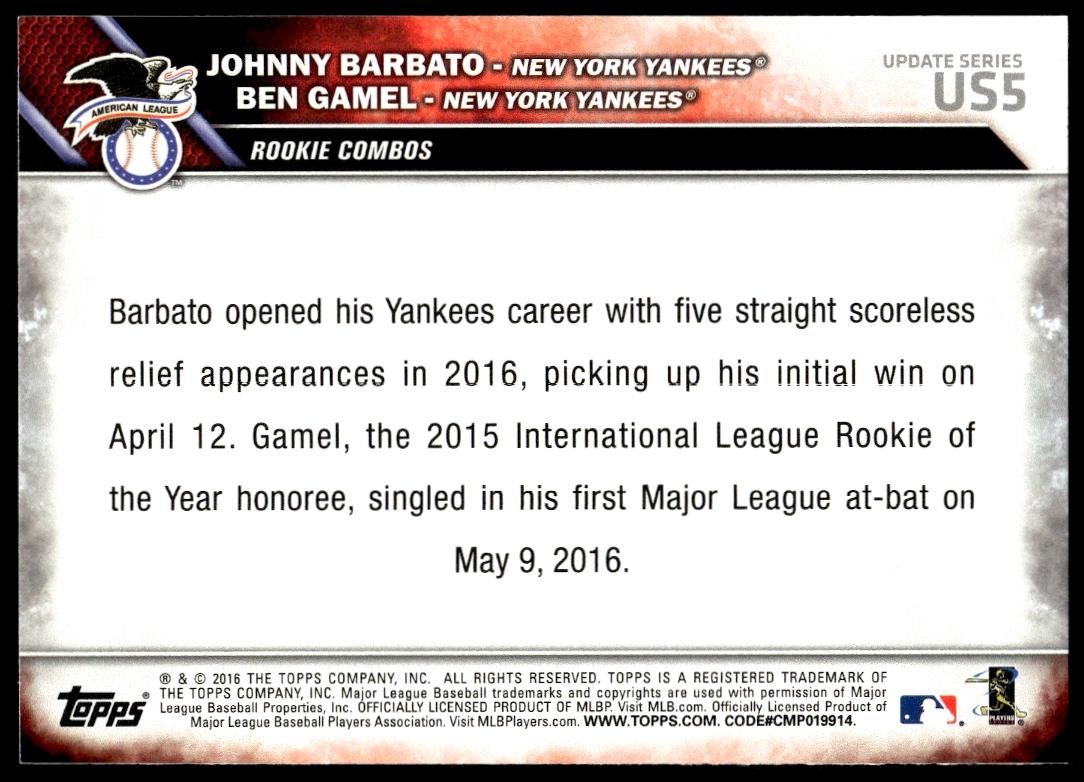 This BaseballΒ card, from 2016 is part of the Topps UpdateΒ card set. Johnny Barbato / Ben Gamel is featured and has a card number of US5.