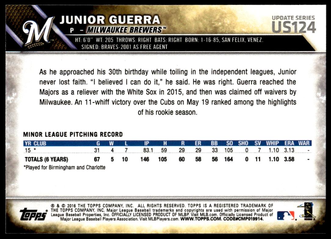 This BaseballΒ card, from 2016 is part of the Topps UpdateΒ card set. Junior Guerra is featured and has a card number of US124.