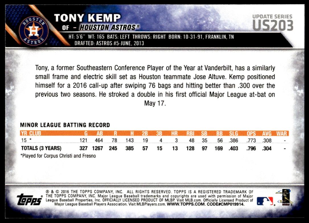 This BaseballΒ card, from 2016 is part of the Topps UpdateΒ card set. Tony Kemp is featured and has a card number of US203.