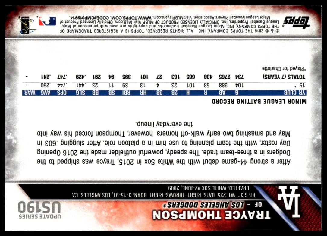 This BaseballΒ card, from 2016 is part of the Topps UpdateΒ card set. Trayce Thompson is featured and has a card number of US190.