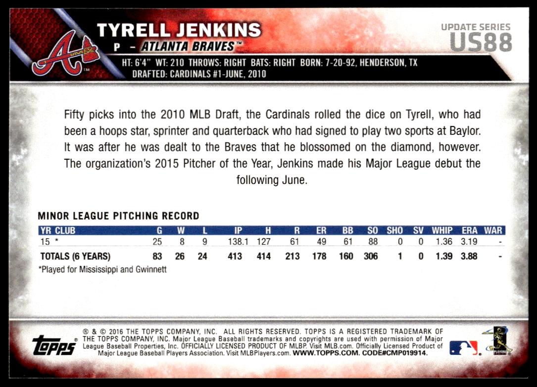 This BaseballΒ card, from 2016 is part of the Topps UpdateΒ card set. Tyrell Jenkins is featured and has a card number of US88.