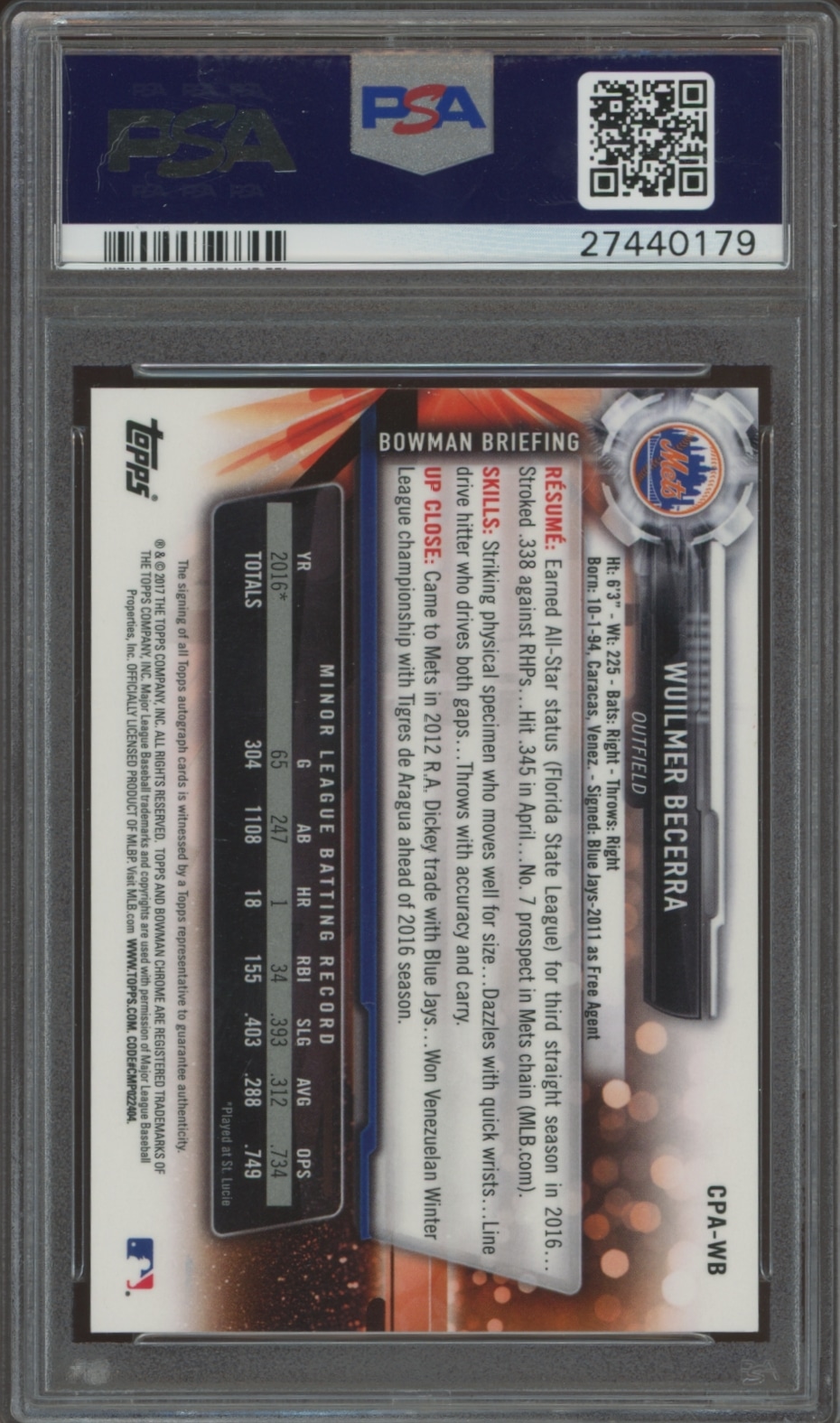 This Baseball card, from 2017 is part of the Bowman card set. Wuilmer Becerra is featured and has a card number of CPA-WB. It is graded by PSA and has a numeric grade of 10.