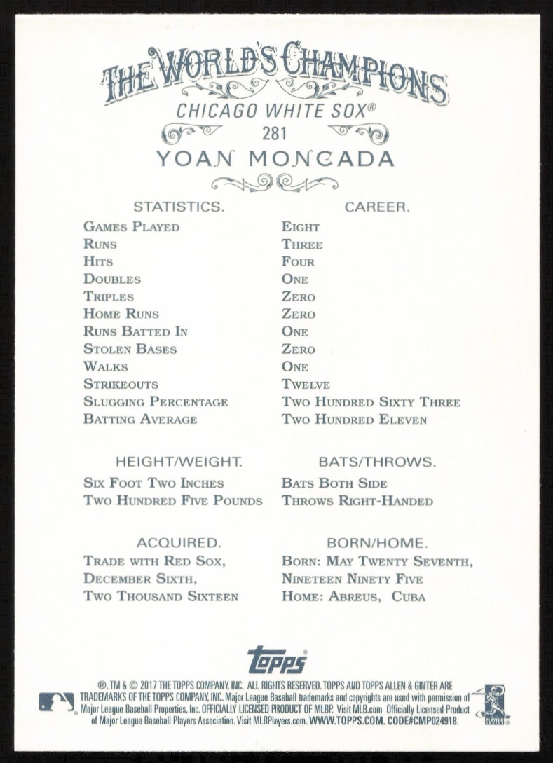 This Baseball card, from 2017 is part of the Topps Allen & Ginter card set. Yoan Moncada is featured and has a card number of 281.