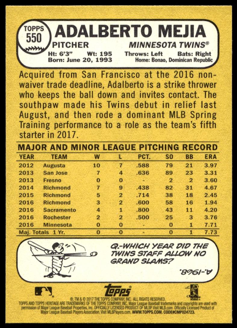 This BaseballΒ card, from 2017 is part of the Topps HeritageΒ card set. Adalberto Mejia is featured and has a card number of 550.
