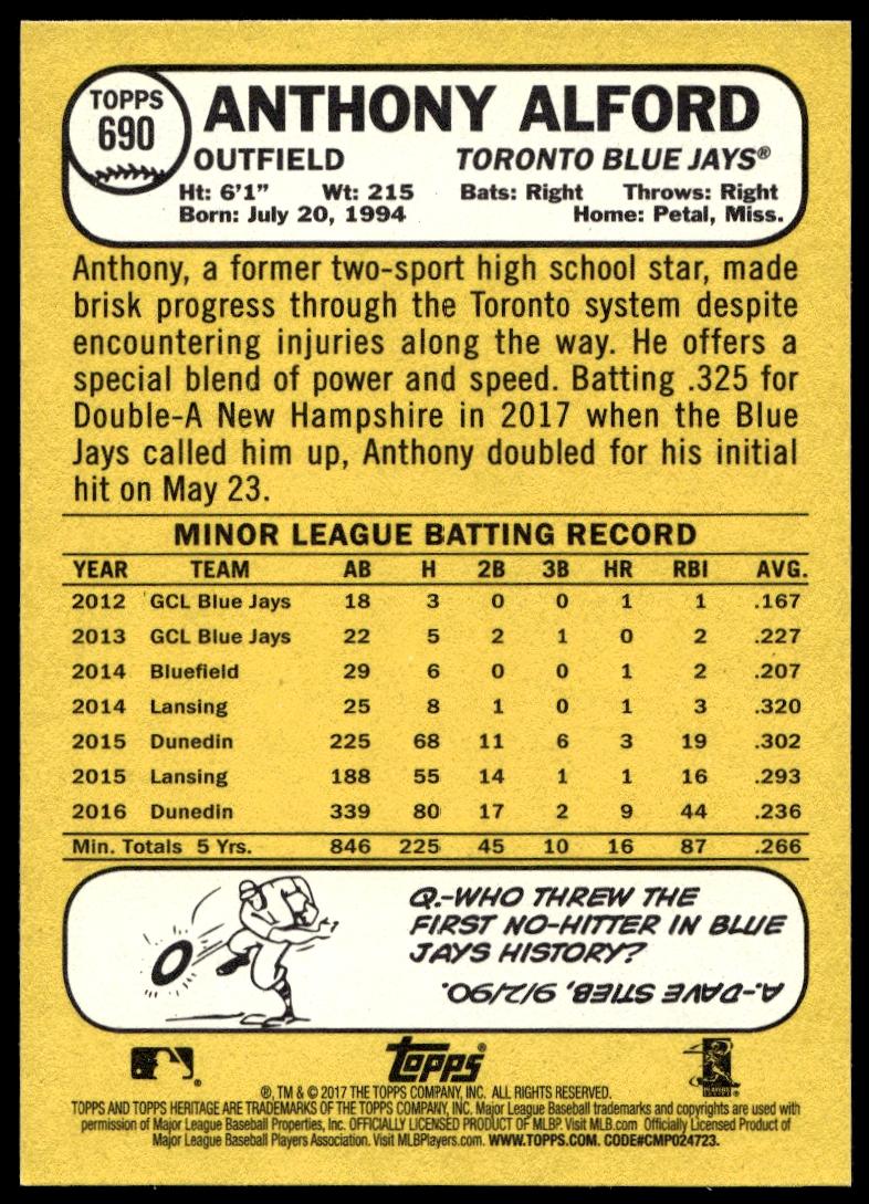 This Baseball card, from 2017 is part of the Topps Heritage card set. Anthony Alford is featured and has a card number of 690.