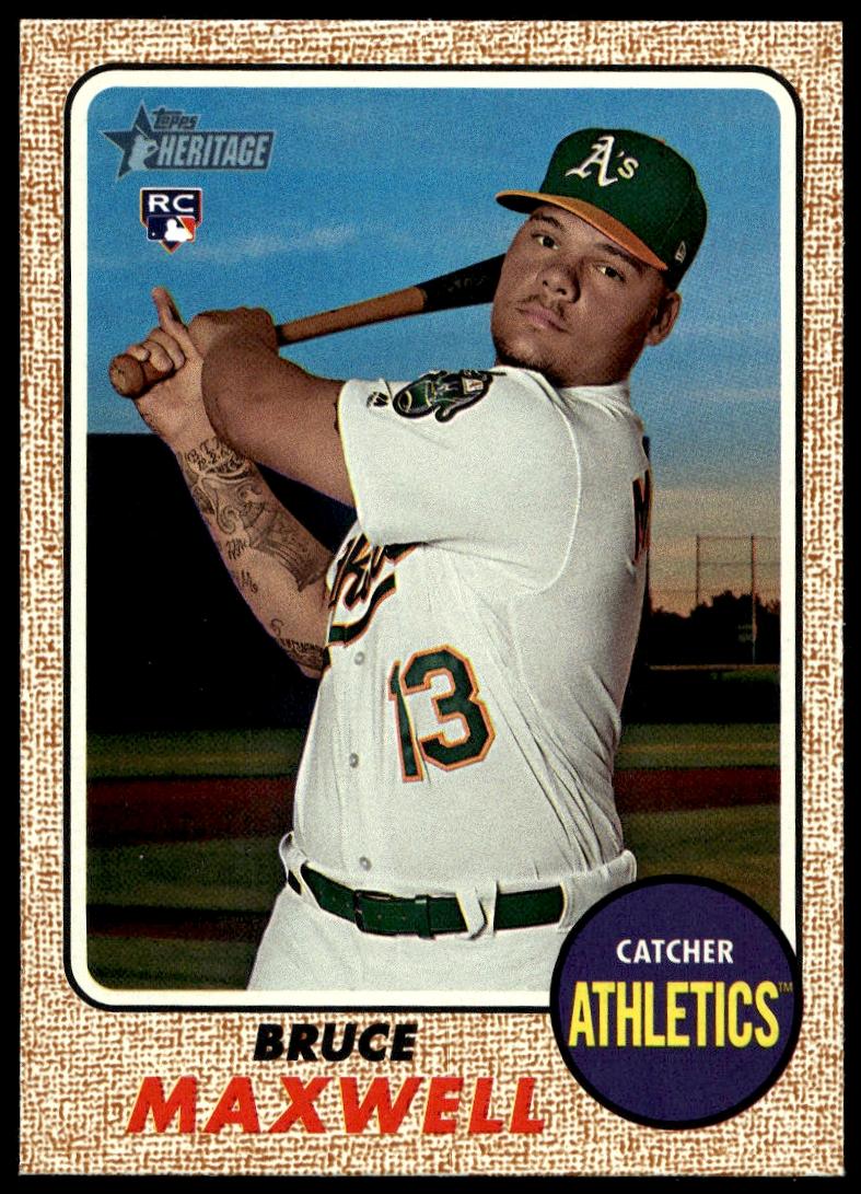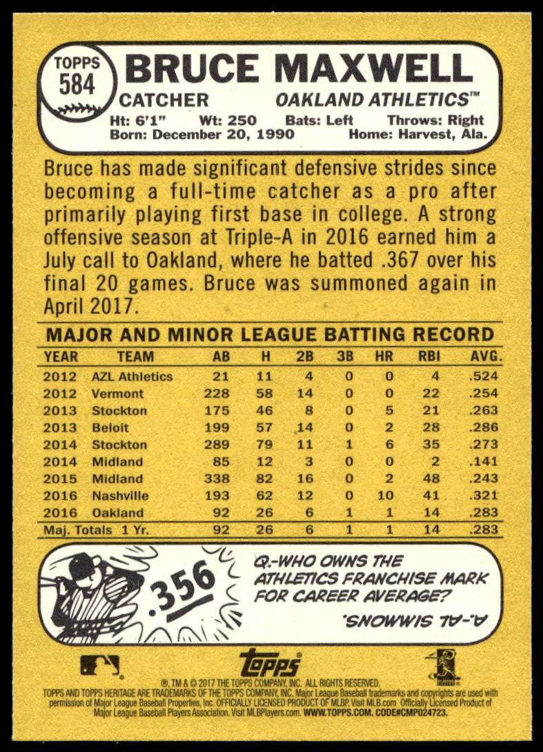 This Baseball card, from 2017 is part of the Topps Heritage card set. Bruce Maxwell is featured and has a card number of 584.