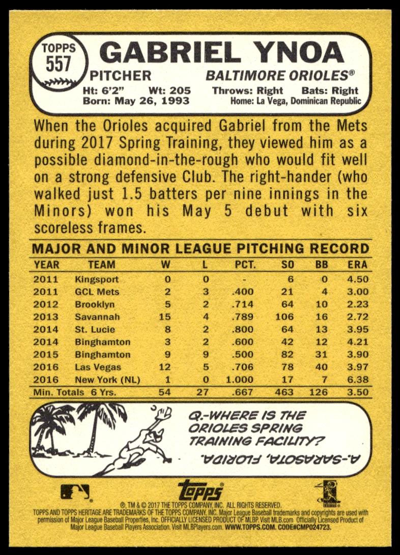 This Baseball card, from 2017 is part of the Topps Heritage card set. Gabriel Ynoa is featured and has a card number of 557.