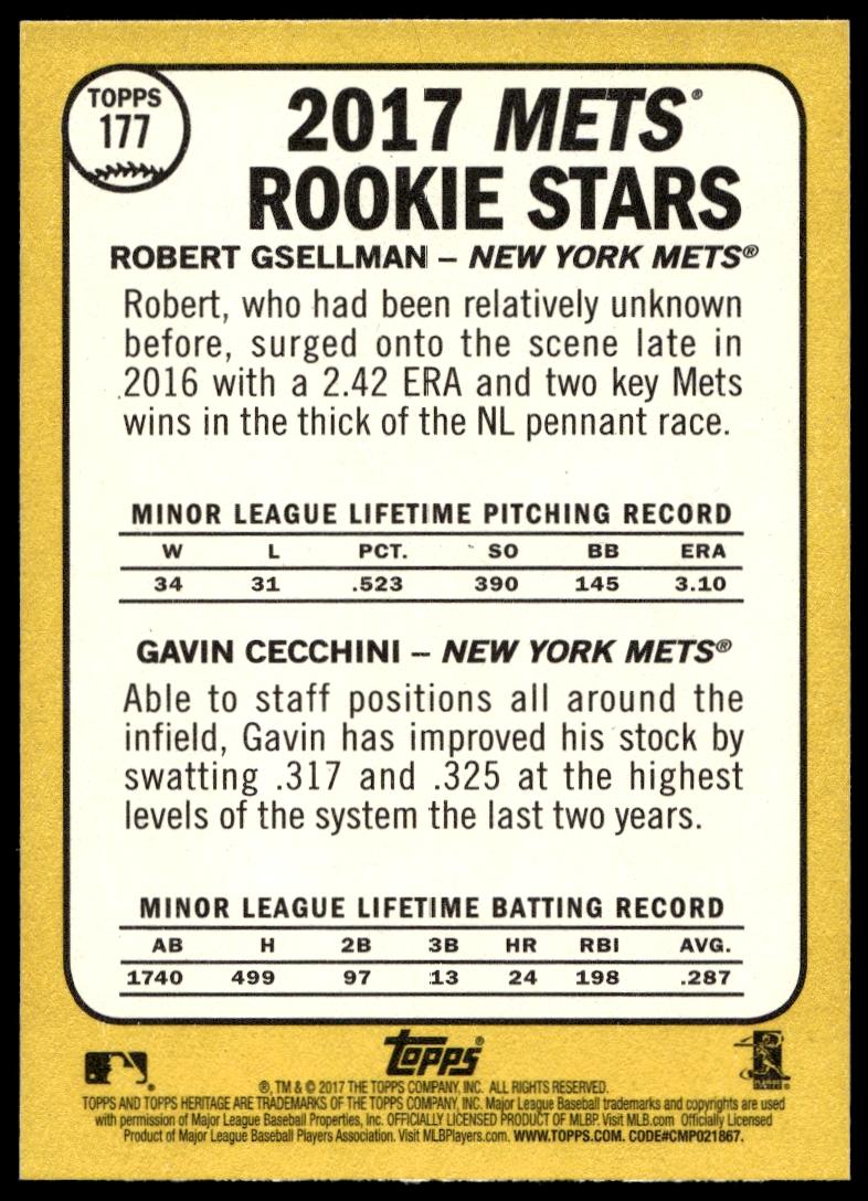This BaseballΒ card, from 2017 is part of the Topps HeritageΒ card set. Gavin Cecchini / Robert Gsellman is featured and has a card number of 177.