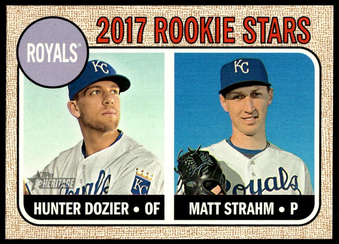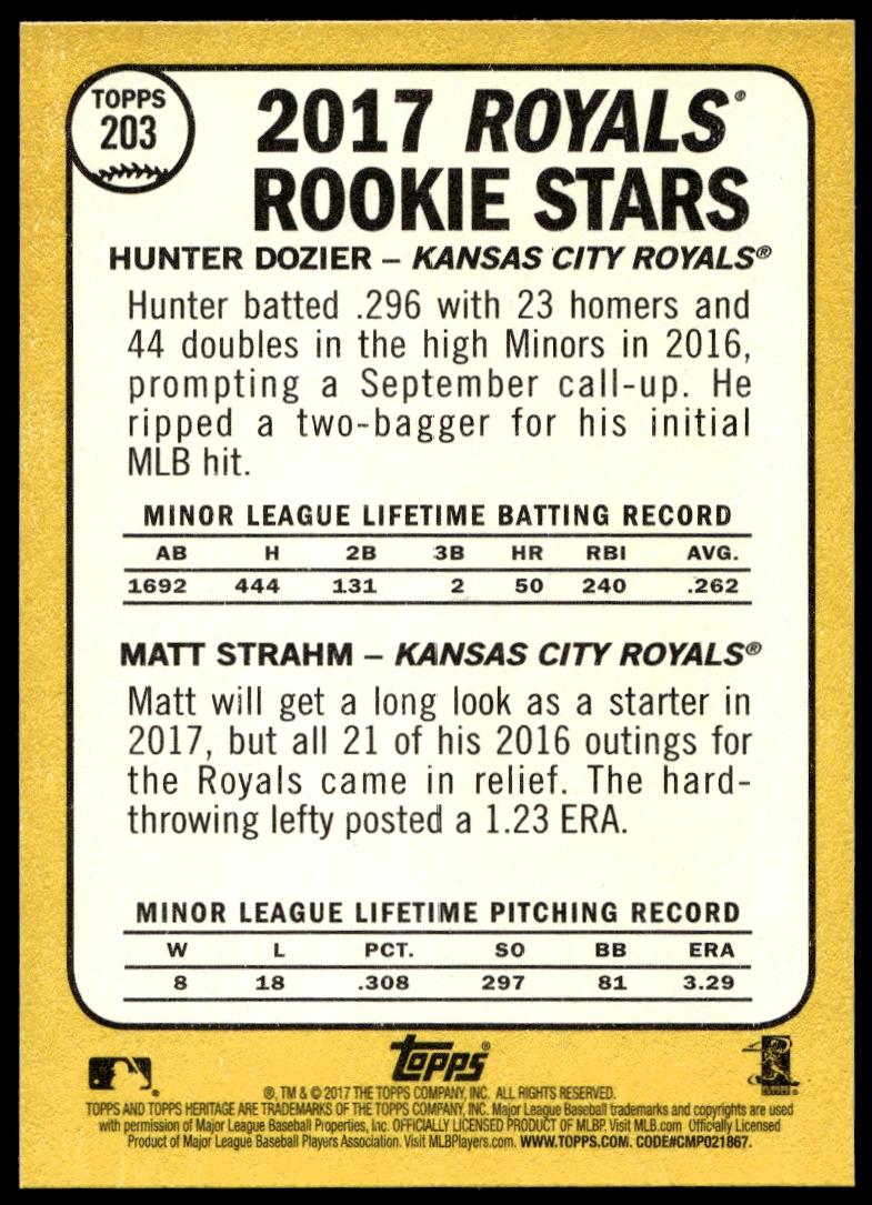 This BaseballΒ card, from 2017 is part of the Topps HeritageΒ card set. Hunter Dozier / Matt Strahm is featured and has a card number of 203.