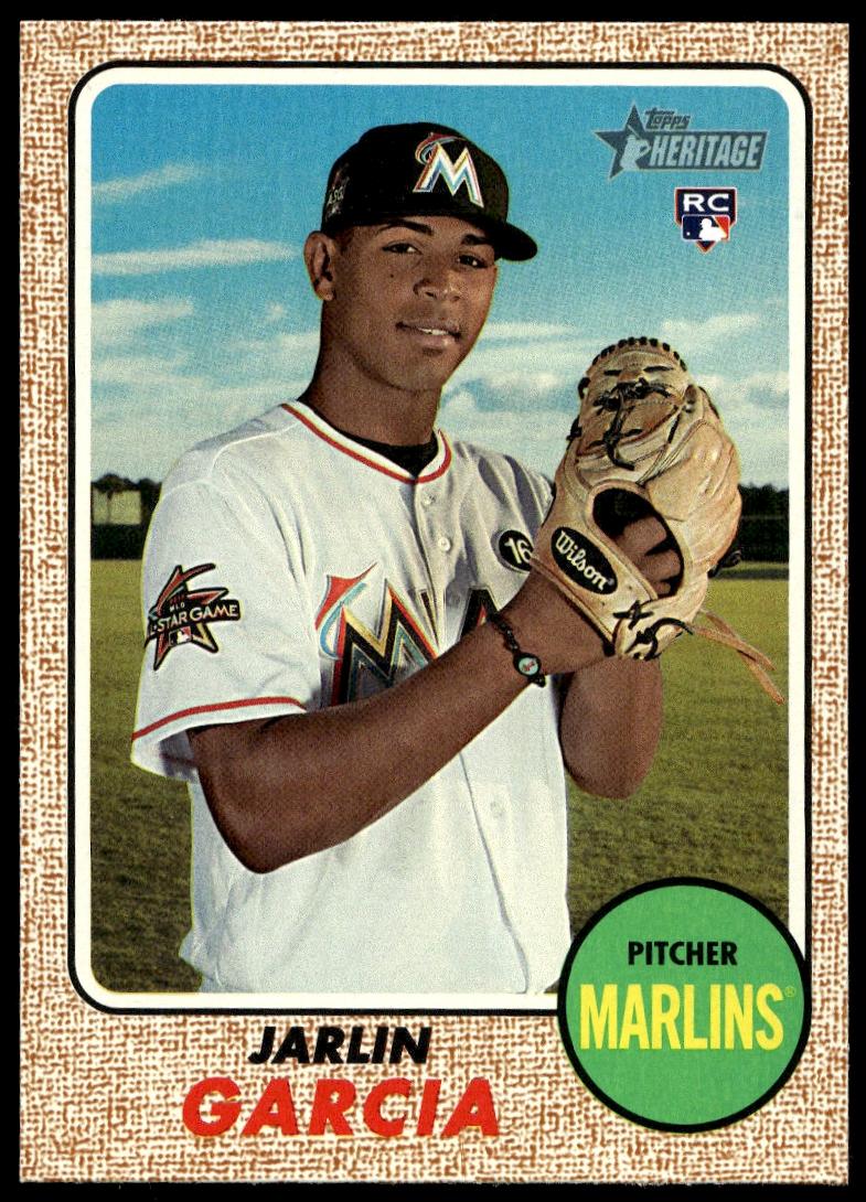 This BaseballΒ card, from 2017 is part of the Topps HeritageΒ card set. Jarlin Garcia is featured and has a card number of 643.