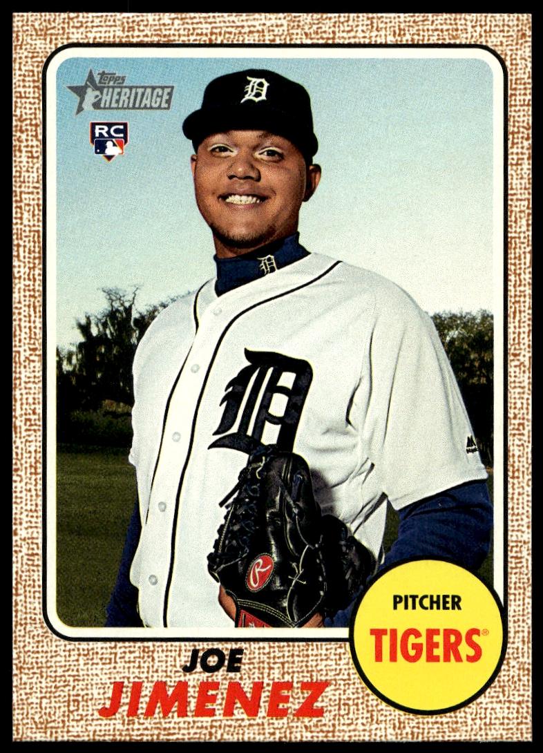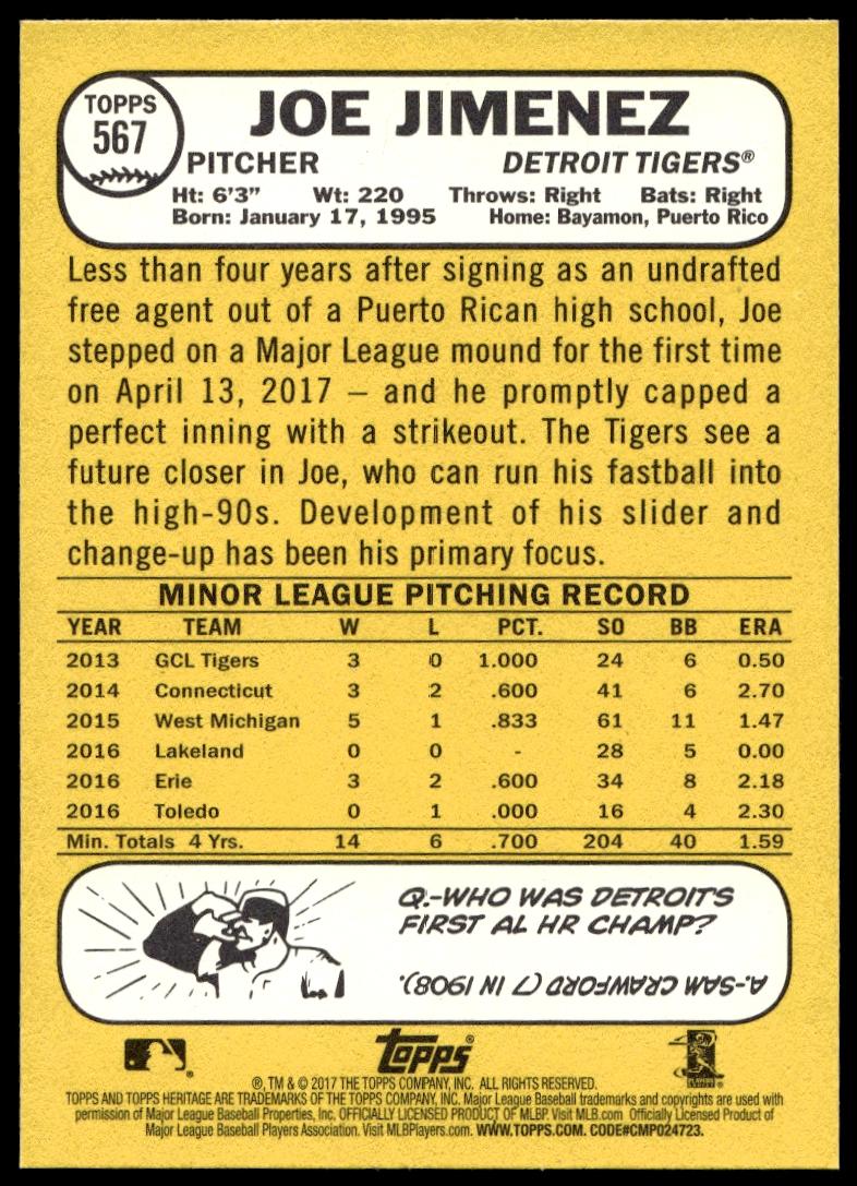 This BaseballΒ card, from 2017 is part of the Topps HeritageΒ card set. Joe Jimenez is featured and has a card number of 567.