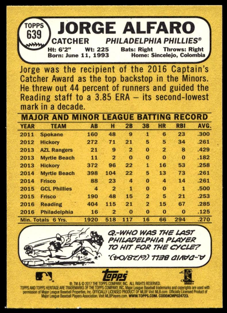 This BaseballΒ card, from 2017 is part of the Topps HeritageΒ card set. Jorge Alfaro is featured and has a card number of 639.