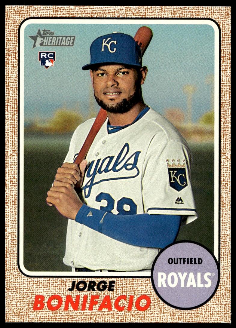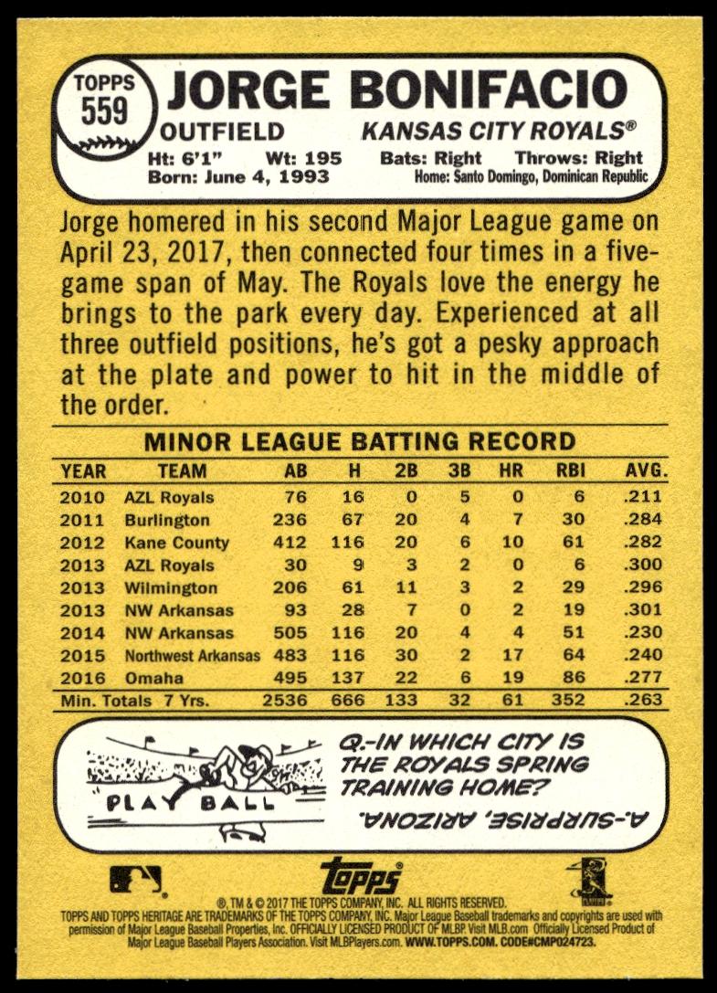 This BaseballΒ card, from 2017 is part of the Topps HeritageΒ card set. Jorge Bonifacio is featured and has a card number of 559.