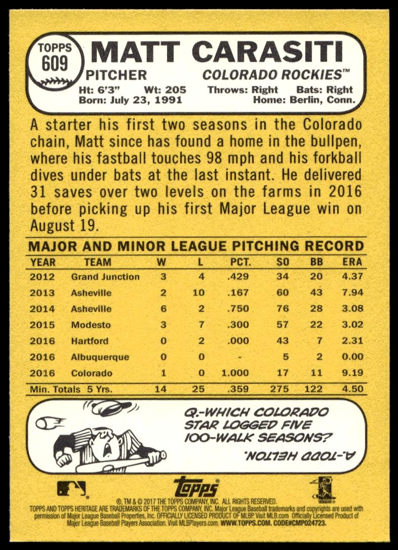 This BaseballΒ card, from 2017 is part of the Topps HeritageΒ card set. Matt Carasiti is featured and has a card number of 609.