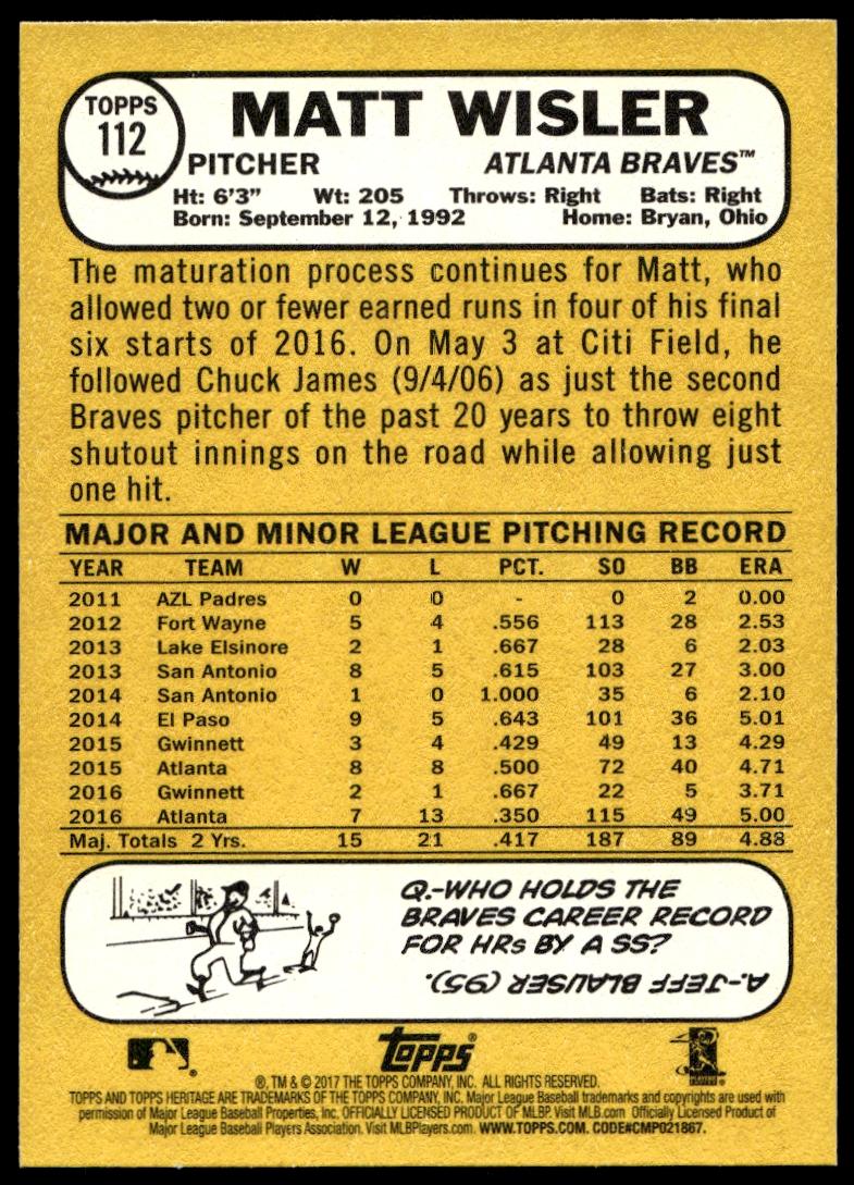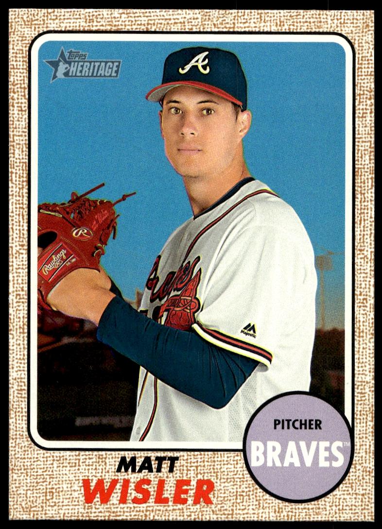 This BaseballΒ card, from 2017 is part of the Topps HeritageΒ card set. Matt Wisler is featured and has a card number of 112.