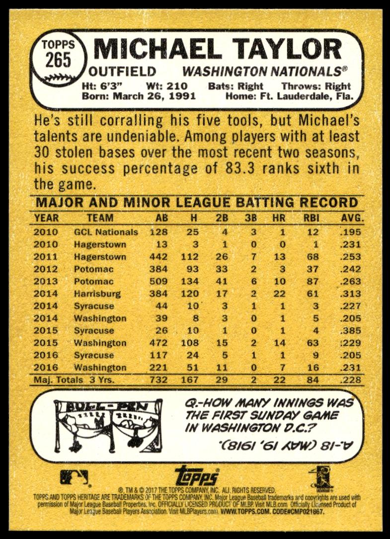 This Baseball card, from 2017 is part of the Topps Heritage card set. Michael Taylor is featured and has a card number of 265.