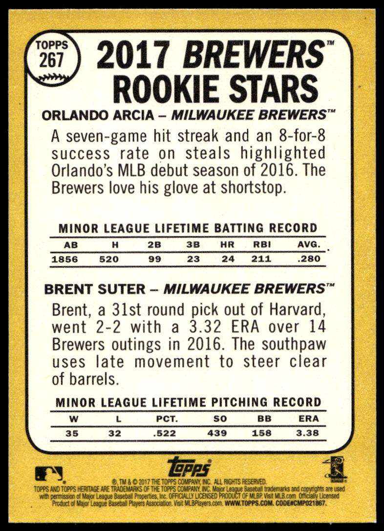 This BaseballΒ card, from 2017 is part of the Topps HeritageΒ card set. Orlando Arcia / Brent Suter is featured and has a card number of 267.