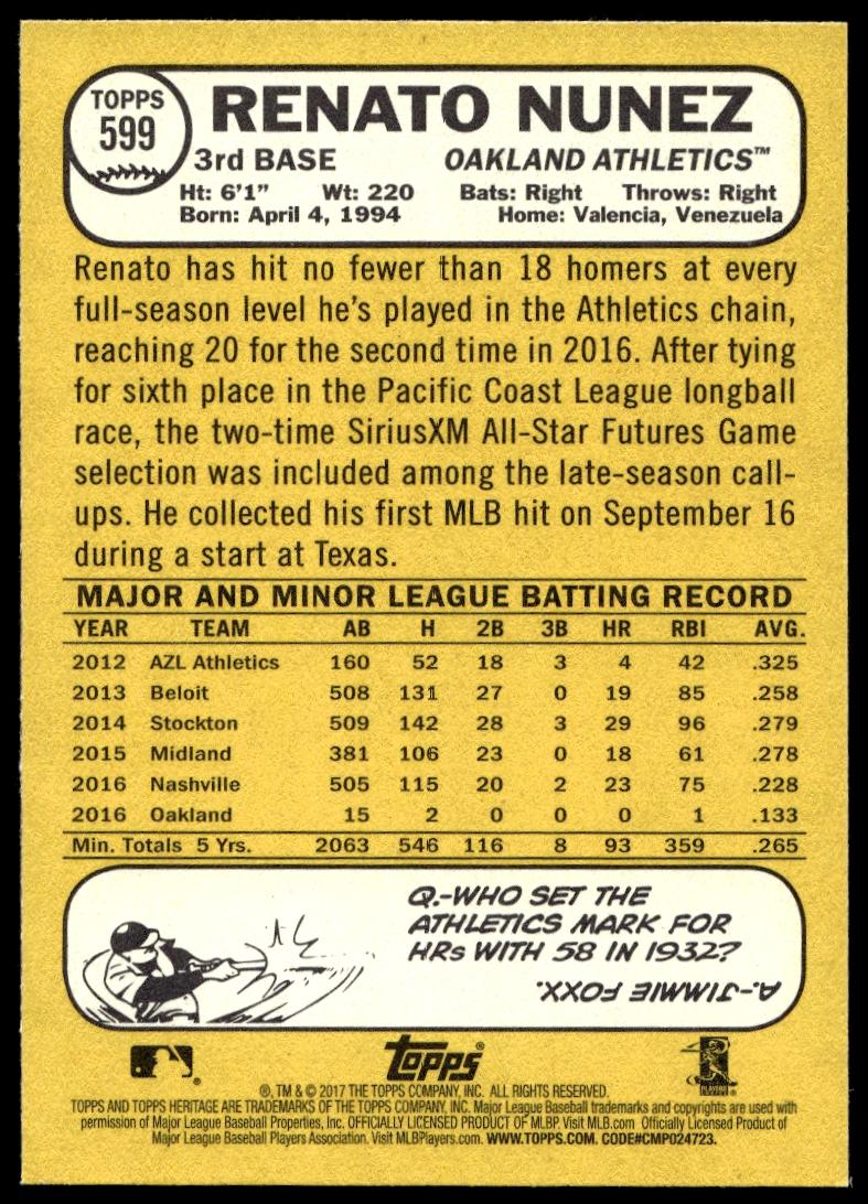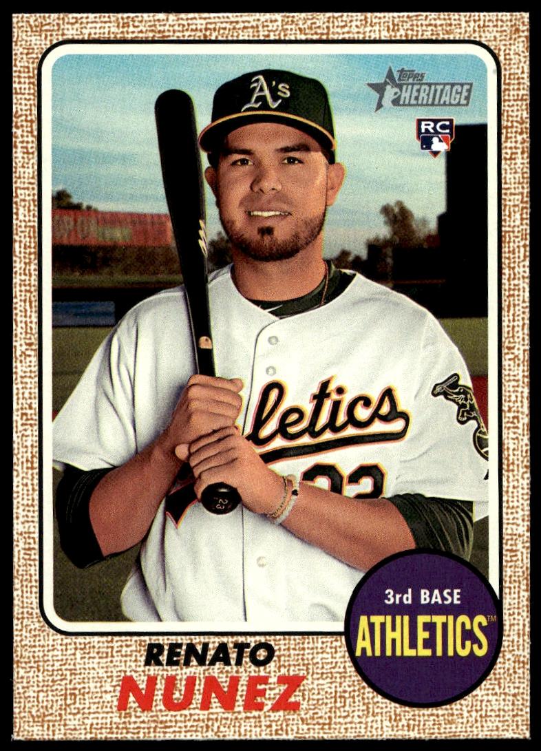 This BaseballΒ card, from 2017 is part of the Topps HeritageΒ card set. Renato Nunez is featured and has a card number of 599.