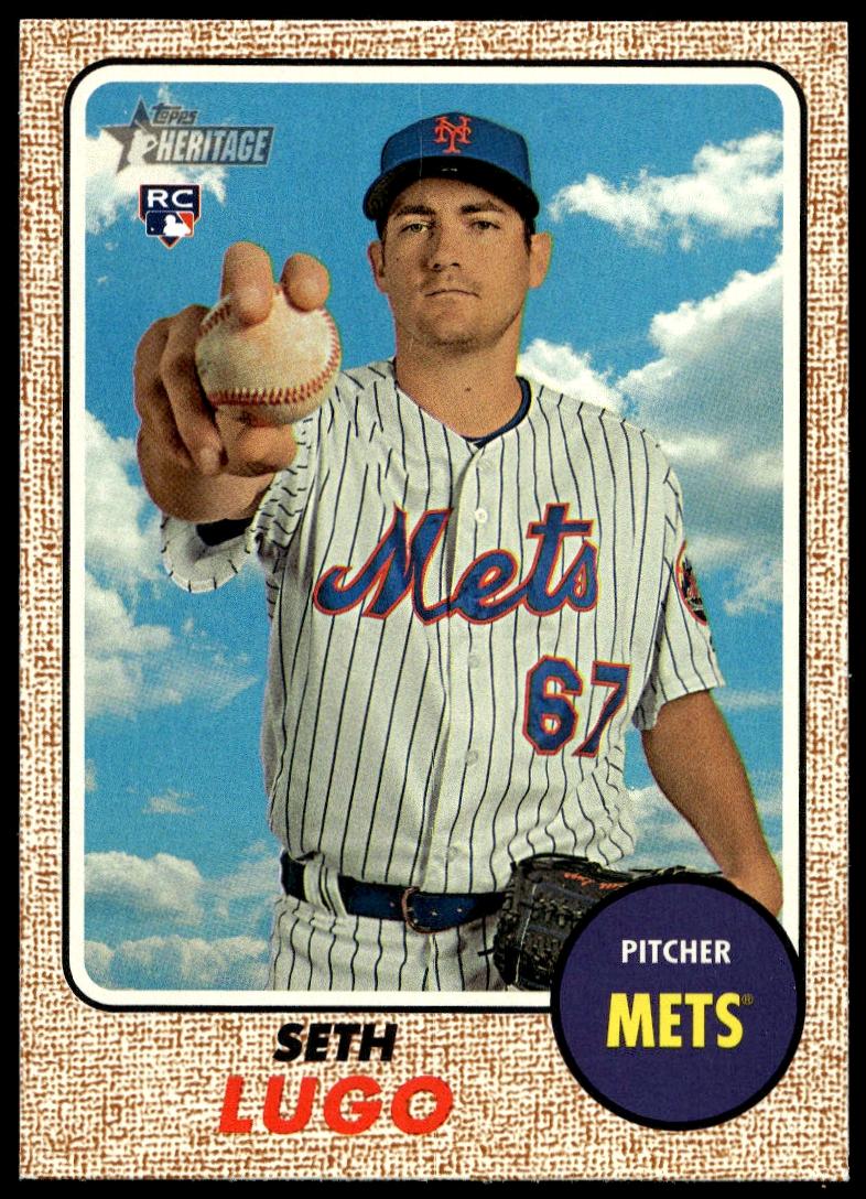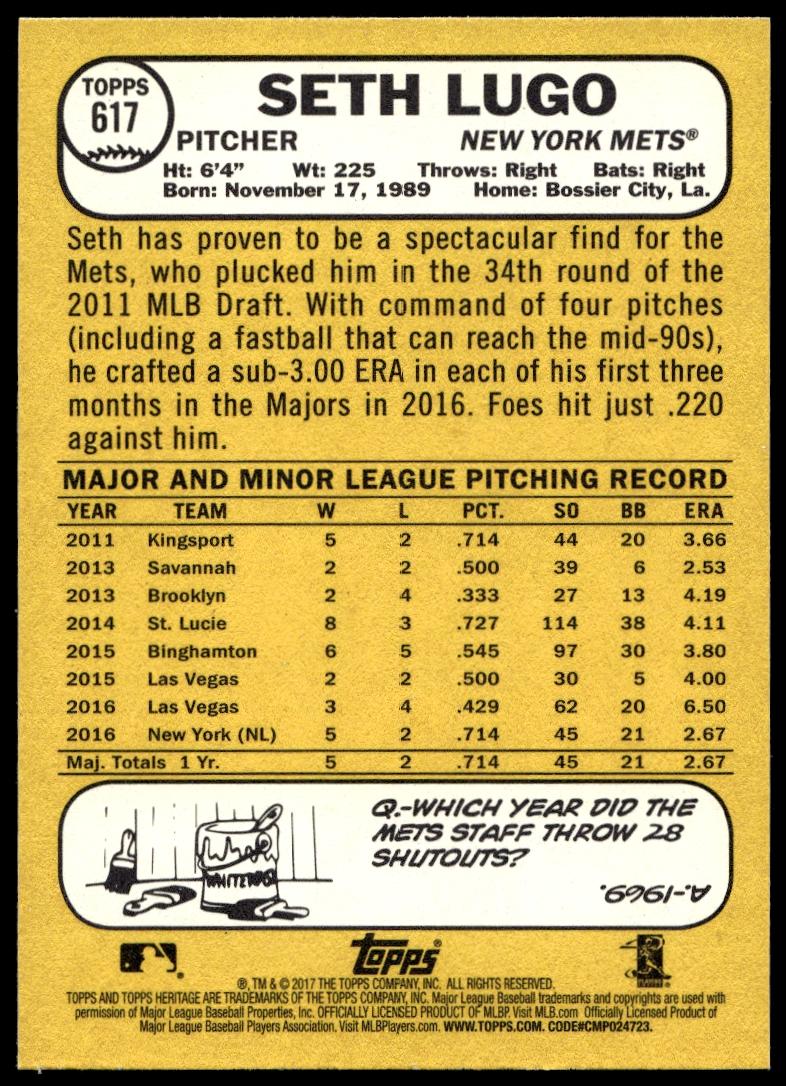 This Baseball card, from 2017 is part of the Topps Heritage card set. Seth Lugo is featured and has a card number of 617.