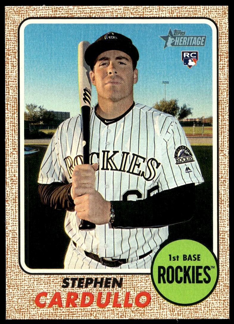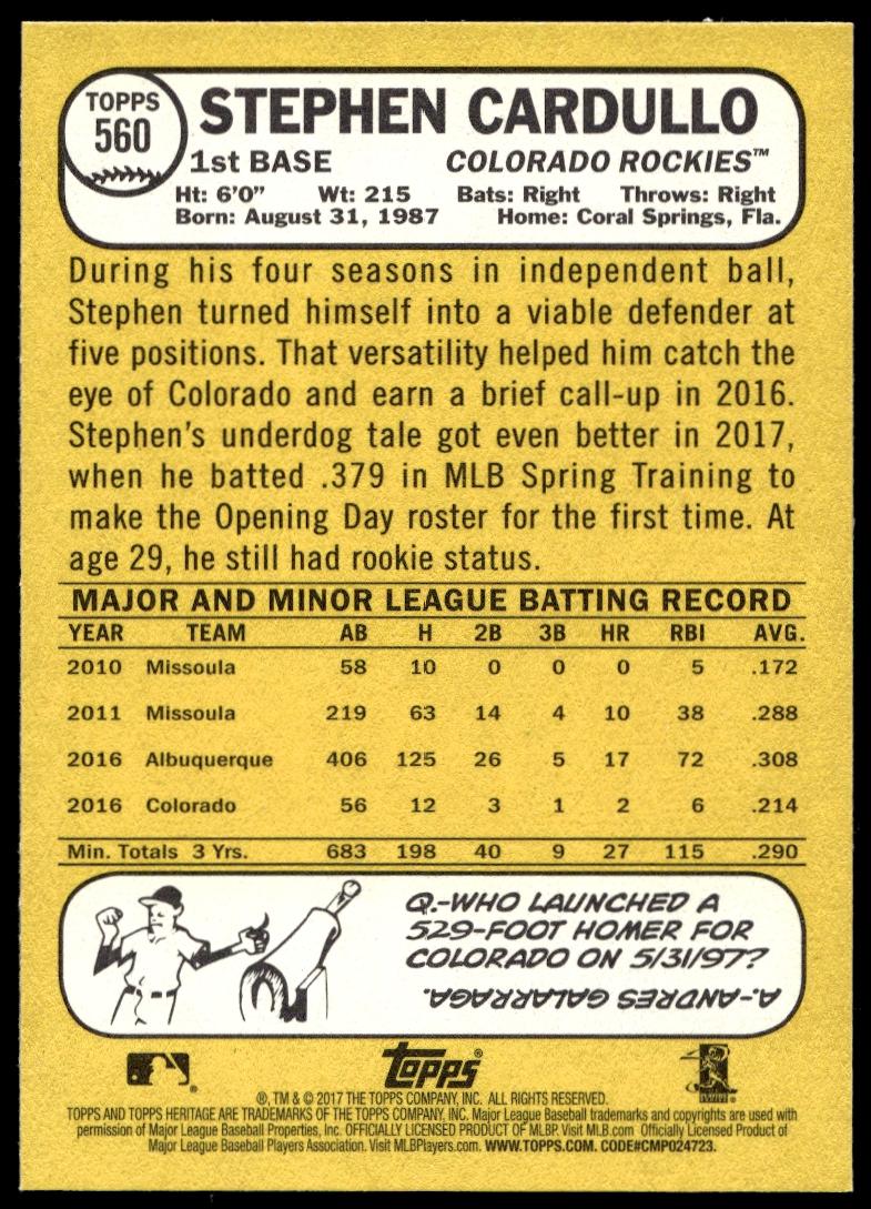 This Baseball card, from 2017 is part of the Topps Heritage card set. Stephen Cardullo is featured and has a card number of 560.