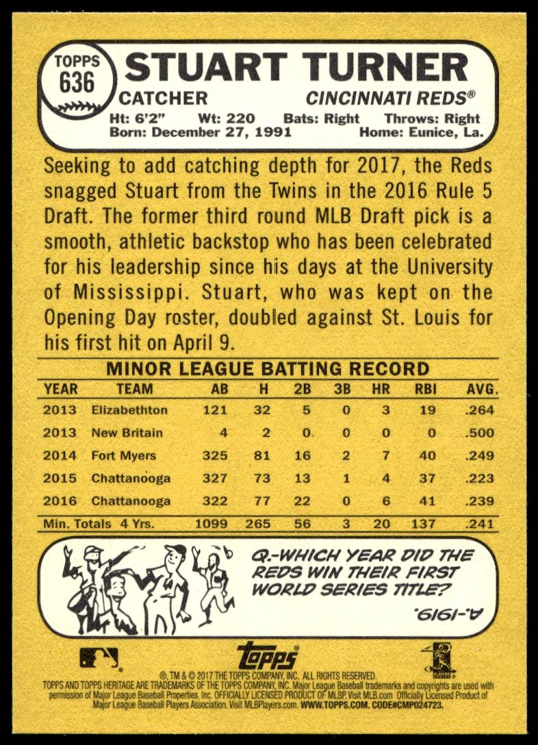 This Baseball card, from 2017 is part of the Topps Heritage card set. Stuart Turner is featured and has a card number of 636.