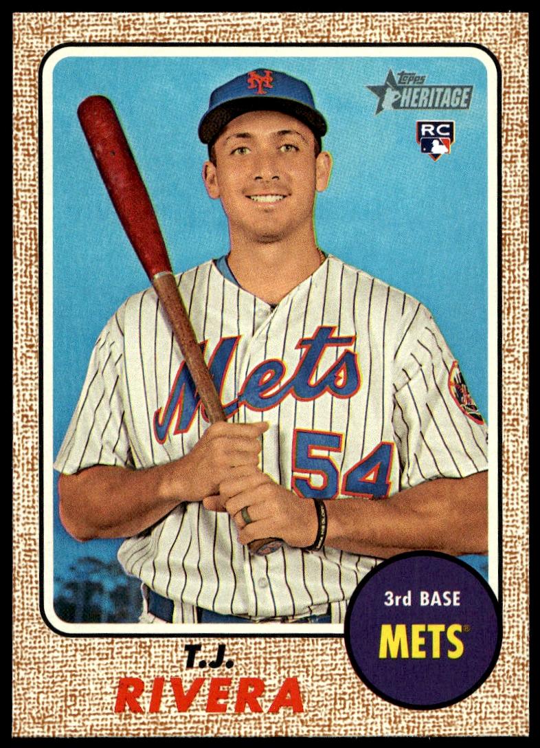 This Baseball card, from 2017 is part of the Topps Heritage card set. T.J. Rivera is featured and has a card number of 697.