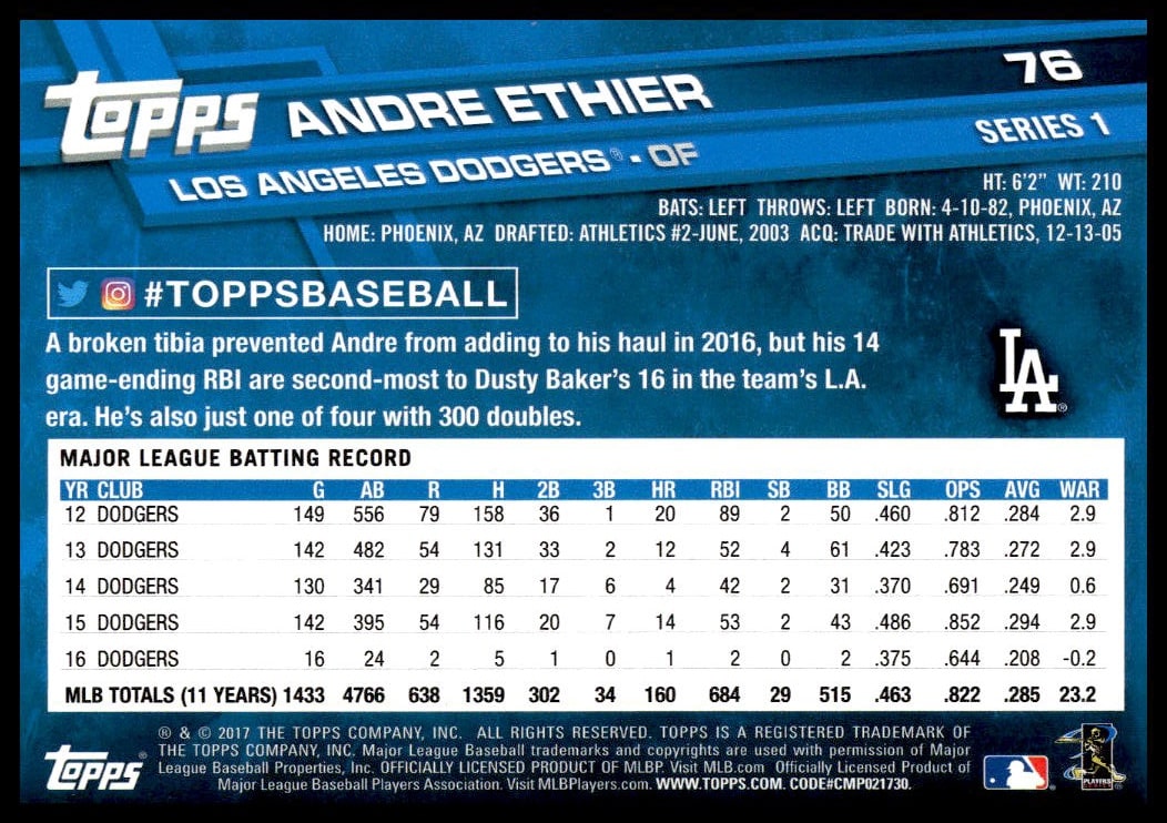 This Baseball card, from 2017 is part of the Topps Series 1 card set. Andre Ethier is featured and has a card number of 76.