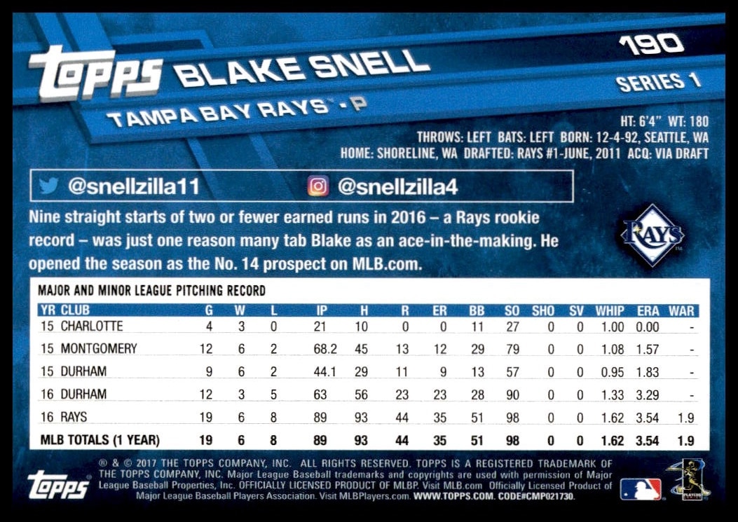 This Baseball card, from 2017 is part of the Topps Series 1 card set. Blake Snell is featured and has a card number of 190.