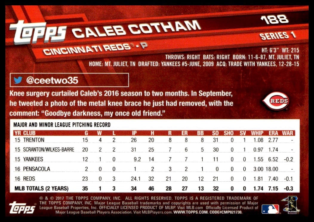 This Baseball card, from 2017 is part of the Topps Series 1 card set. Caleb Cotham is featured and has a card number of 188.