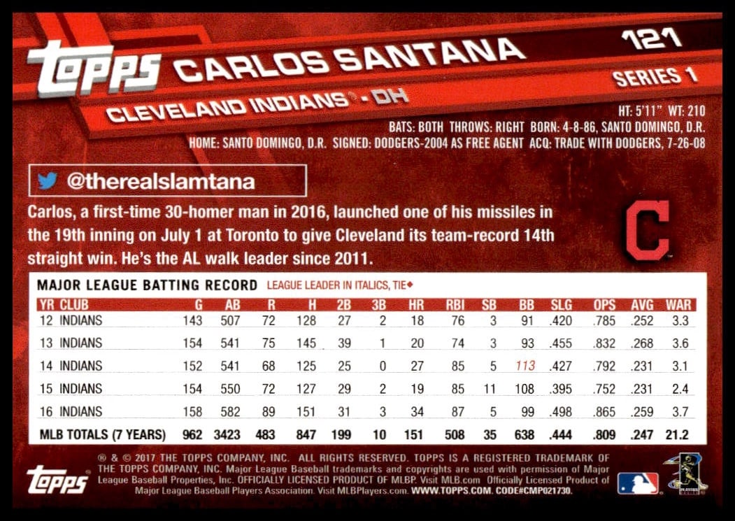 This BaseballΒ card, from 2017 is part of the Topps Series 1Β card set. Carlos Santana is featured and has a card number of 121.