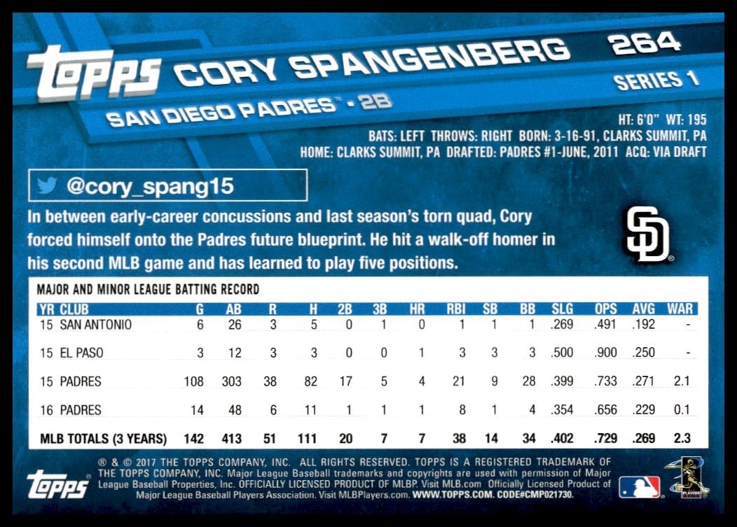 This Baseball card, from 2017 is part of the Topps Series 1 card set. Cory Spangenberg is featured and has a card number of 264.