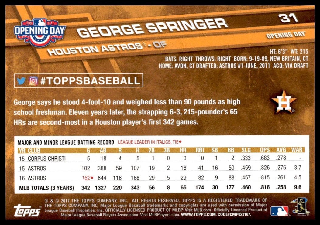 This BaseballΒ card, from 2017 is part of the Topps Series 1Β card set. George Springer is featured and has a card number of 31.