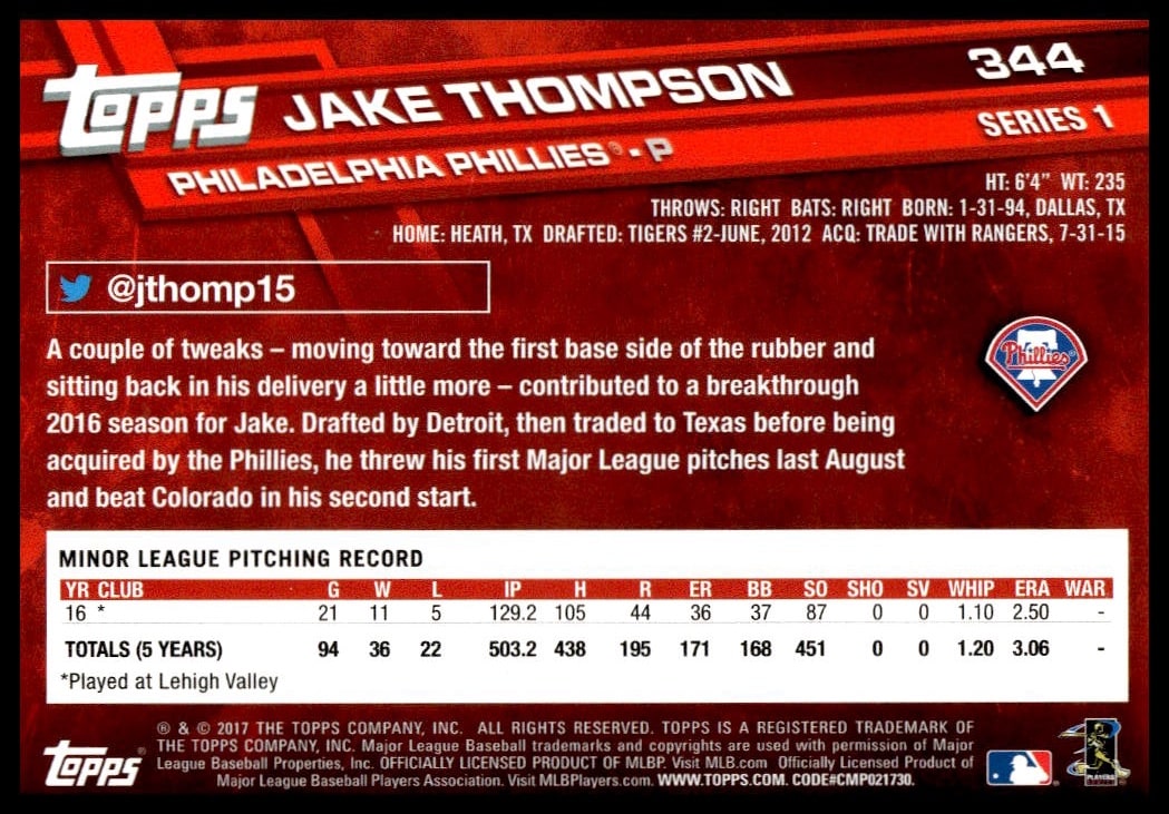 This Baseball card, from 2017 is part of the Topps Series 1 card set. Jake Thompson is featured and has a card number of 344.