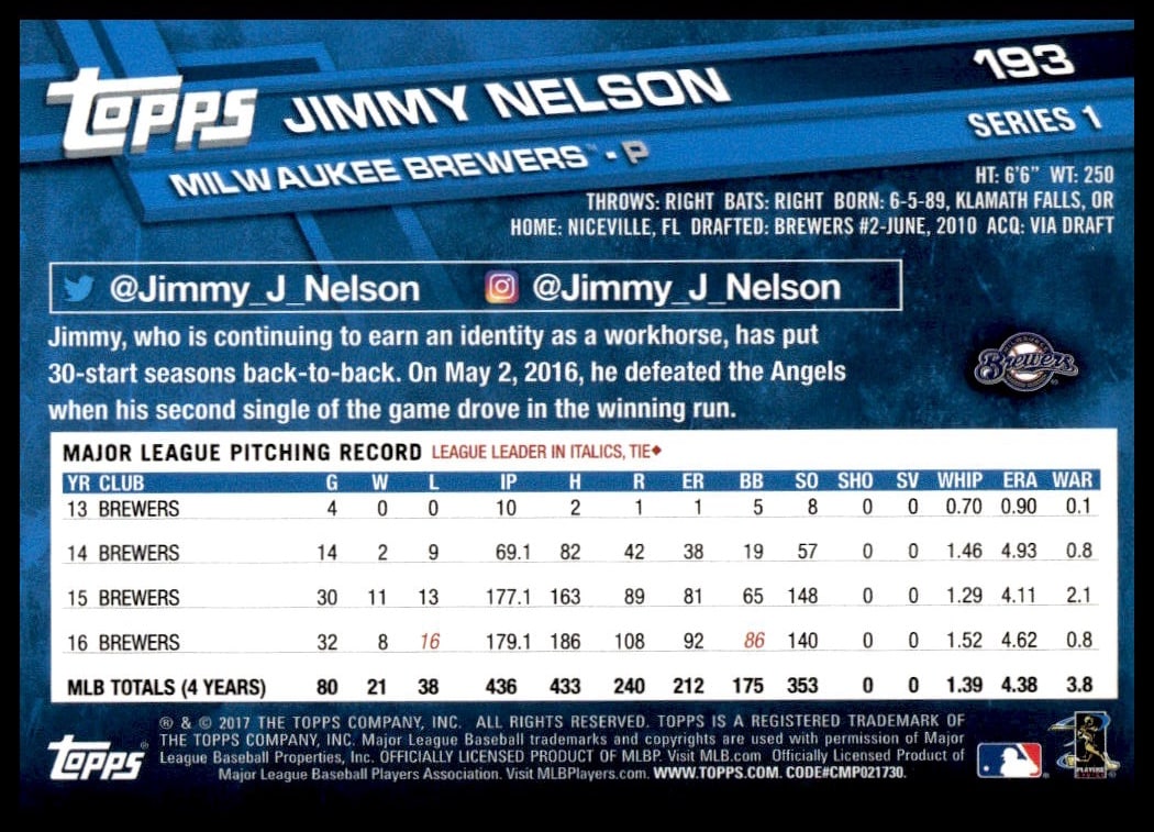 This BaseballΒ card, from 2017 is part of the Topps Series 1Β card set. Jimmy Nelson is featured and has a card number of 193.