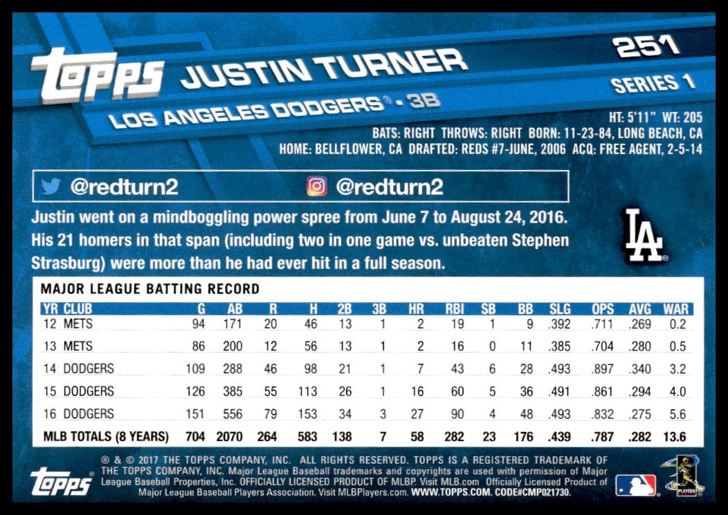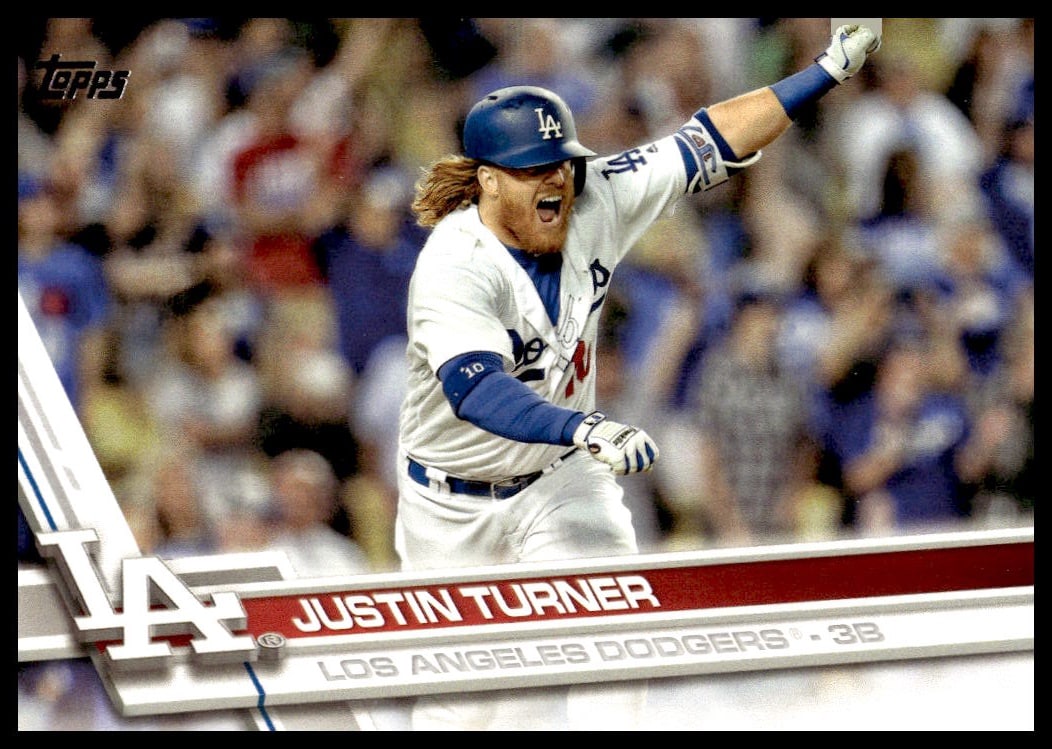 This BaseballΒ card, from 2017 is part of the Topps Series 1Β card set. Justin Turner is featured and has a card number of 4.