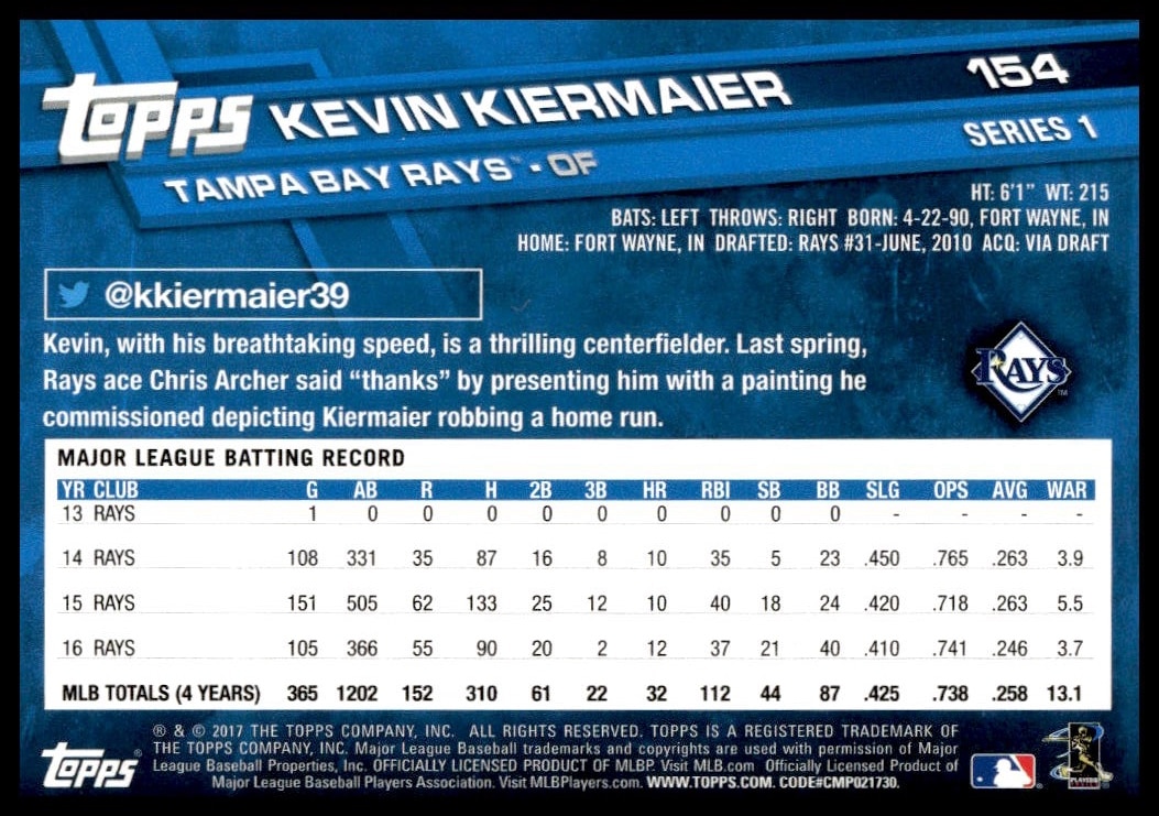 This BaseballΒ card, from 2017 is part of the Topps Series 1Β card set. Kevin Kiermaier is featured and has a card number of 154.