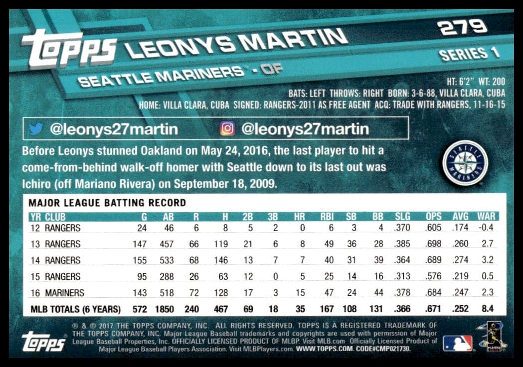 This BaseballΒ card, from 2017 is part of the Topps Series 1Β card set. Leonys Martin is featured and has a card number of 279.