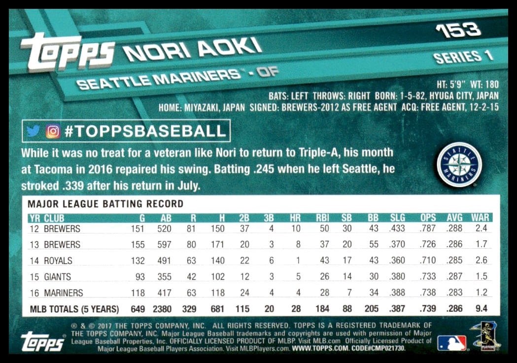 This Baseball card, from 2017 is part of the Topps Series 1 card set. Nori Aoki is featured and has a card number of 153.