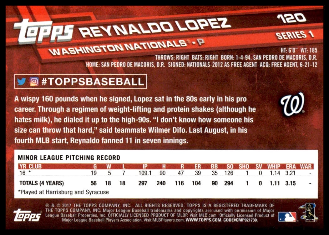 This BaseballΒ card, from 2017 is part of the Topps Series 1Β card set. Reynaldo Lopez is featured and has a card number of 120.