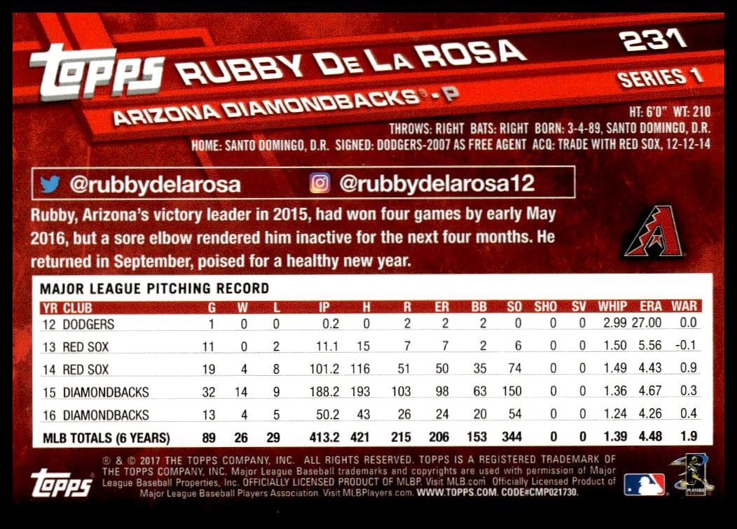 This Baseball card, from 2017 is part of the Topps Series 1 card set. Rubby De La Rosa is featured and has a card number of 231.