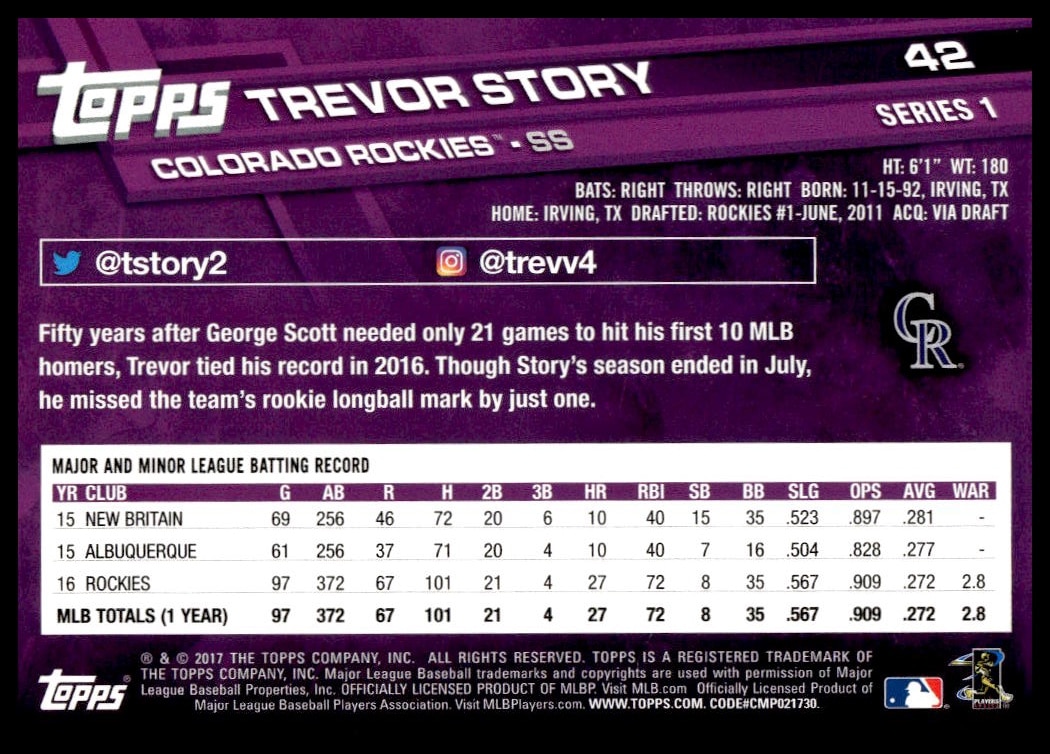 This BaseballΒ card, from 2017 is part of the Topps Series 1Β card set. Trevor Story is featured and has a card number of 42.