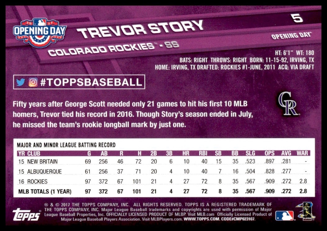 This BaseballΒ card, from 2017 is part of the Topps Series 1Β card set. Trevor Story is featured and has a card number of 5.