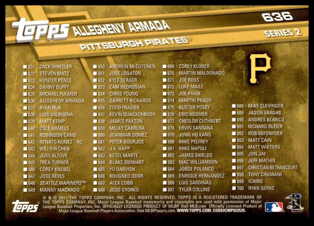 This Baseball card, from 2017 is part of the Topps Series 2 card set. Allegheny Armada is featured and has a card number of 636.