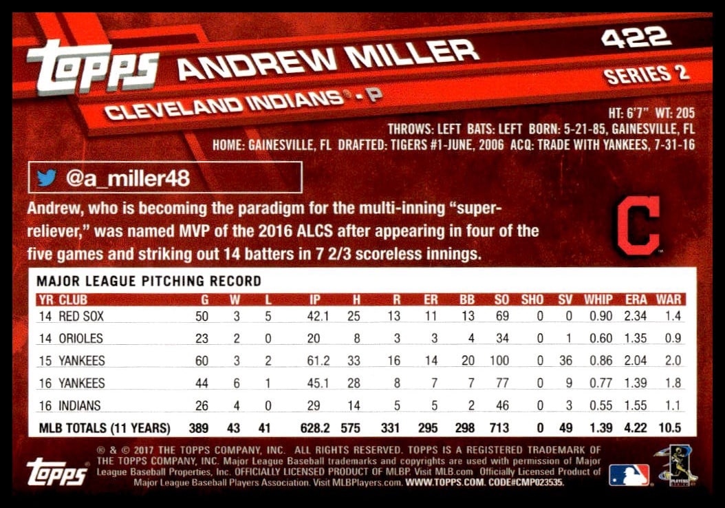 This BaseballΒ card, from 2017 is part of the Topps Series 2Β card set. Andrew Miller is featured and has a card number of 422.