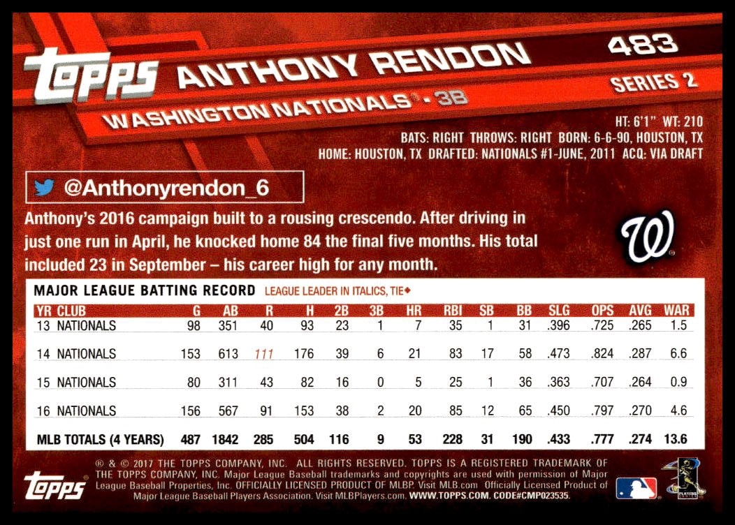 This BaseballΒ card, from 2017 is part of the Topps Series 2Β card set. Anthony Rendon is featured and has a card number of 483.
