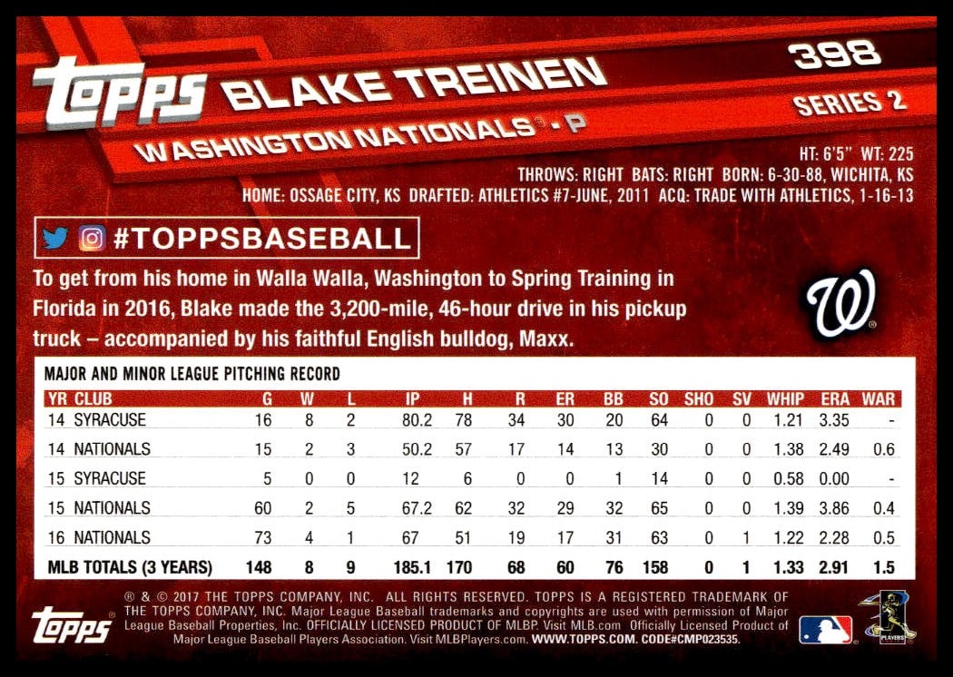 This BaseballΒ card, from 2017 is part of the Topps Series 2Β card set. Blake Treinen is featured and has a card number of 398.